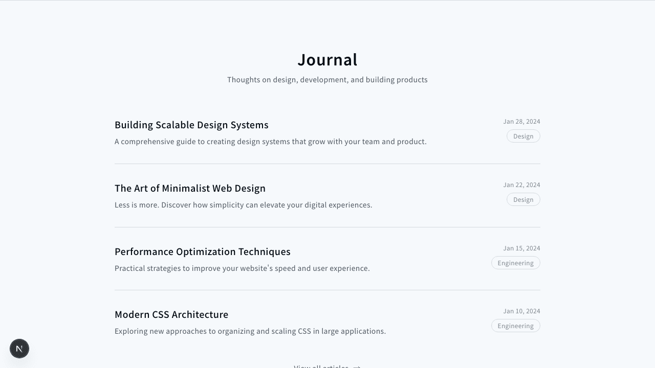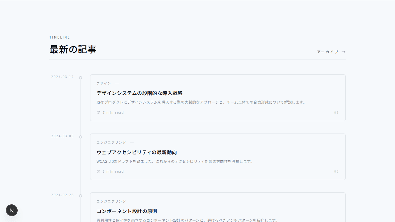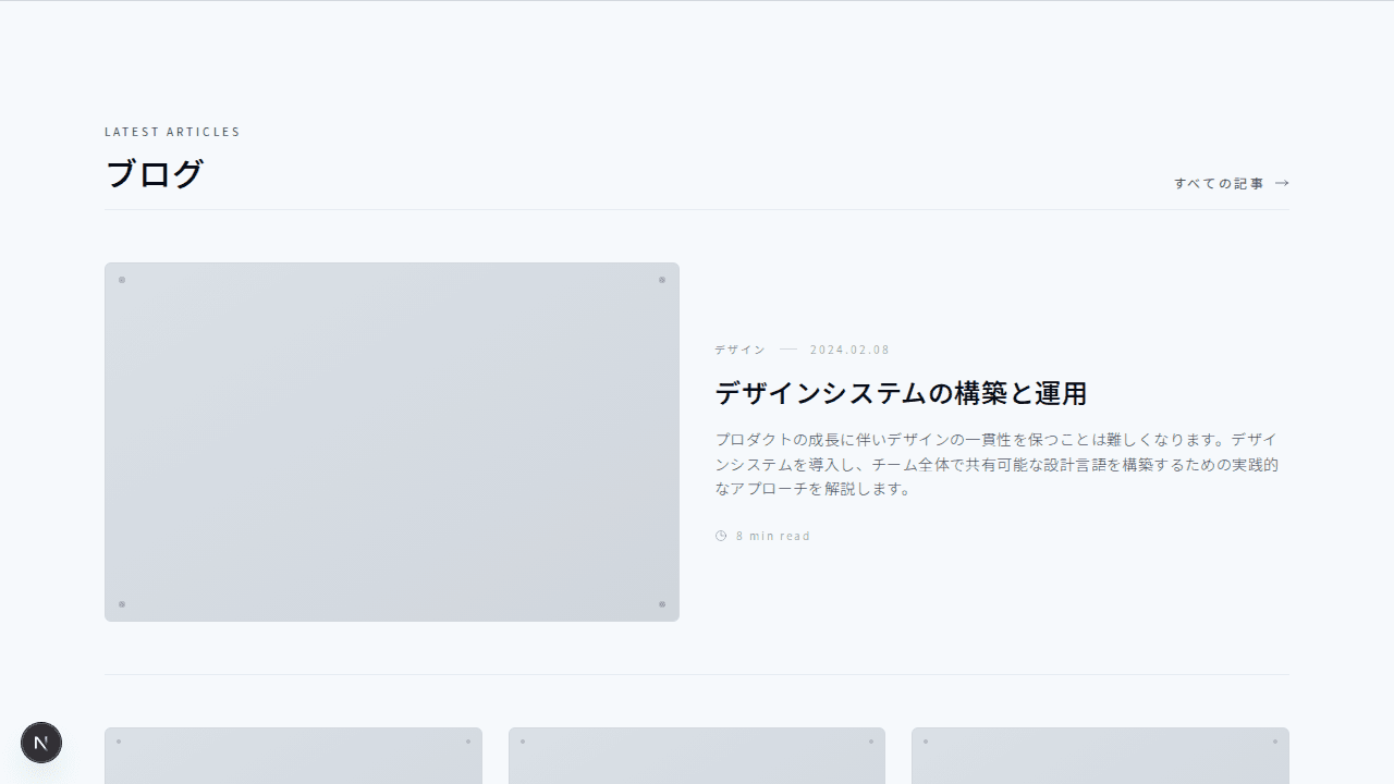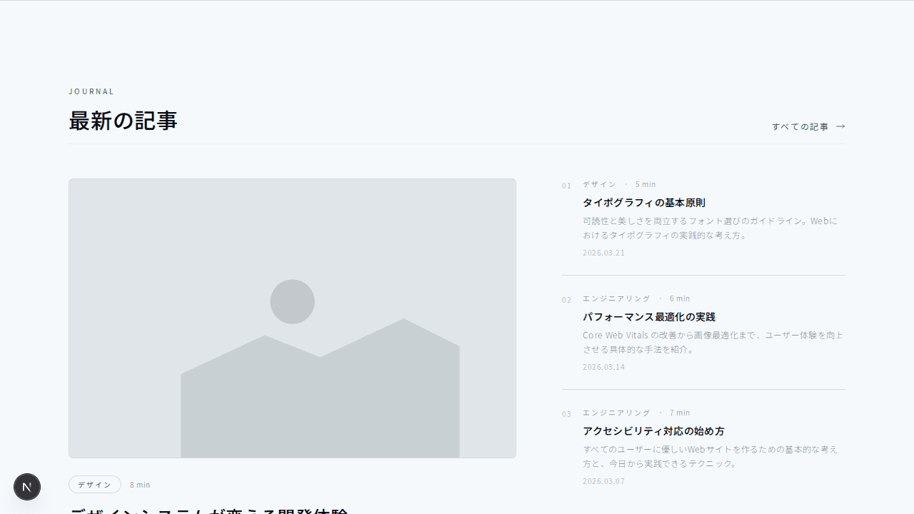 1export function BlogGrid001() {2 const posts = [3 {4 title: "デザインシステムの構築と運用",5 excerpt:6 "スケーラブルなデザインシステムを構築するためのベストプラクティスと、チームでの効率的な運用方法について解説します。",7 date: "2024.02.01",8 category: "デザイン",9 readTime: "5 min",10 },11 {12 title: "モダンCSSアーキテクチャ入門",13 excerpt:14 "CSS ModulesからTailwind CSSまで、大規模アプリケーションにおけるCSS設計の最新アプローチを比較します。",15 date: "2024.01.28",16 category: "エンジニアリング",17 readTime: "8 min",18 },19 {20 title: "ユーザー体験を高めるマイクロインタラクション",21 excerpt:22 "小さなアニメーションやフィードバックが、プロダクト全体の印象にどれほど影響するかを事例とともに紹介します。",23 date: "2024.01.22",24 category: "UX",25 readTime: "4 min",26 },27 {28 title: "アクセシビリティを考慮したUI設計",29 excerpt:30 "すべてのユーザーが快適に利用できるインターフェースを設計するための基本原則とチェックリスト。",31 date: "2024.01.15",32 category: "デザイン",33 readTime: "6 min",34 },35 {36 title: "パフォーマンス最適化の実践ガイド",37 excerpt:38 "Core Web Vitalsの改善からバンドルサイズの削減まで、実測に基づいた最適化テクニックを紹介します。",39 date: "2024.01.10",40 category: "エンジニアリング",41 readTime: "7 min",42 },43 {44 title: "カラーパレットの選び方",45 excerpt:46 "ブランドに合ったカラースキームの構築方法と、アクセシビリティを担保するコントラスト比の管理。",47 date: "2024.01.05",48 category: "デザイン",49 readTime: "3 min",50 },51 ];5253 return (54 <section className="bg-background py-28 border-t border-border">55 <div className="mx-auto max-w-6xl px-4 sm:px-6 lg:px-8">56 {/* ヘッダー */}57 <div className="flex flex-col gap-4 sm:flex-row sm:items-end sm:justify-between">58 <div>59 <p className="text-[10px] uppercase tracking-[0.3em] text-muted-foreground">60 Blog61 </p>62 <h2 className="mt-3 text-2xl font-medium tracking-wide text-foreground sm:text-3xl">63 最新の記事64 </h2>65 </div>66 <span className="inline-flex items-center gap-2 text-xs tracking-wide text-muted-foreground transition-colors duration-200 hover:text-foreground">67 すべての記事を見る68 <svg69 className="h-3.5 w-3.5"70 fill="none"71 stroke="currentColor"72 viewBox="0 0 24 24"73 >74 <path75 strokeLinecap="round"76 strokeLinejoin="round"77 strokeWidth={1.5}78 d="M17 8l4 4m0 0l-4 4m4-4H3"79 />80 </svg>81 </span>82 </div>8384 <div className="mt-4 h-px bg-border/40" />8586 {/* 記事グリッド */}87 <div className="mt-12 grid grid-cols-1 gap-x-8 gap-y-12 sm:grid-cols-2 lg:grid-cols-3">88 {posts.map((post) => (89 <article key={post.title} className="group">90 {/* サムネイルプレースホルダー */}91 <div className="aspect-[16/10] overflow-hidden rounded-lg border border-border bg-muted">92 <div className="h-full w-full bg-gradient-to-br from-foreground/5 to-foreground/10 transition-all duration-500 group-hover:from-foreground/10 group-hover:to-foreground/15" />93 </div>9495 {/* メタ情報 */}96 <div className="mt-4 flex items-center gap-3">97 <span className="rounded-full border border-border px-3 py-0.5 text-[10px] uppercase tracking-[0.15em] text-muted-foreground">98 {post.category}99 </span>100 <span className="text-[10px] tracking-[0.15em] text-muted-foreground/50">101 {post.readTime}102 </span>103 </div>104105 {/* タイトル・抜粋 */}106 <h3 className="mt-3 text-sm font-medium tracking-wide text-foreground transition-colors duration-200 group-hover:text-muted-foreground">107 {post.title}108 </h3>109 <p className="mt-2 text-xs font-light leading-relaxed text-muted-foreground/70">110 {post.excerpt}111 </p>112113 {/* 日付 */}114 <time className="mt-4 block text-[10px] tracking-[0.15em] text-muted-foreground/50">115 {post.date}116 </time>117 </article>118 ))}119 </div>120 </div>121 </section>122 );123}