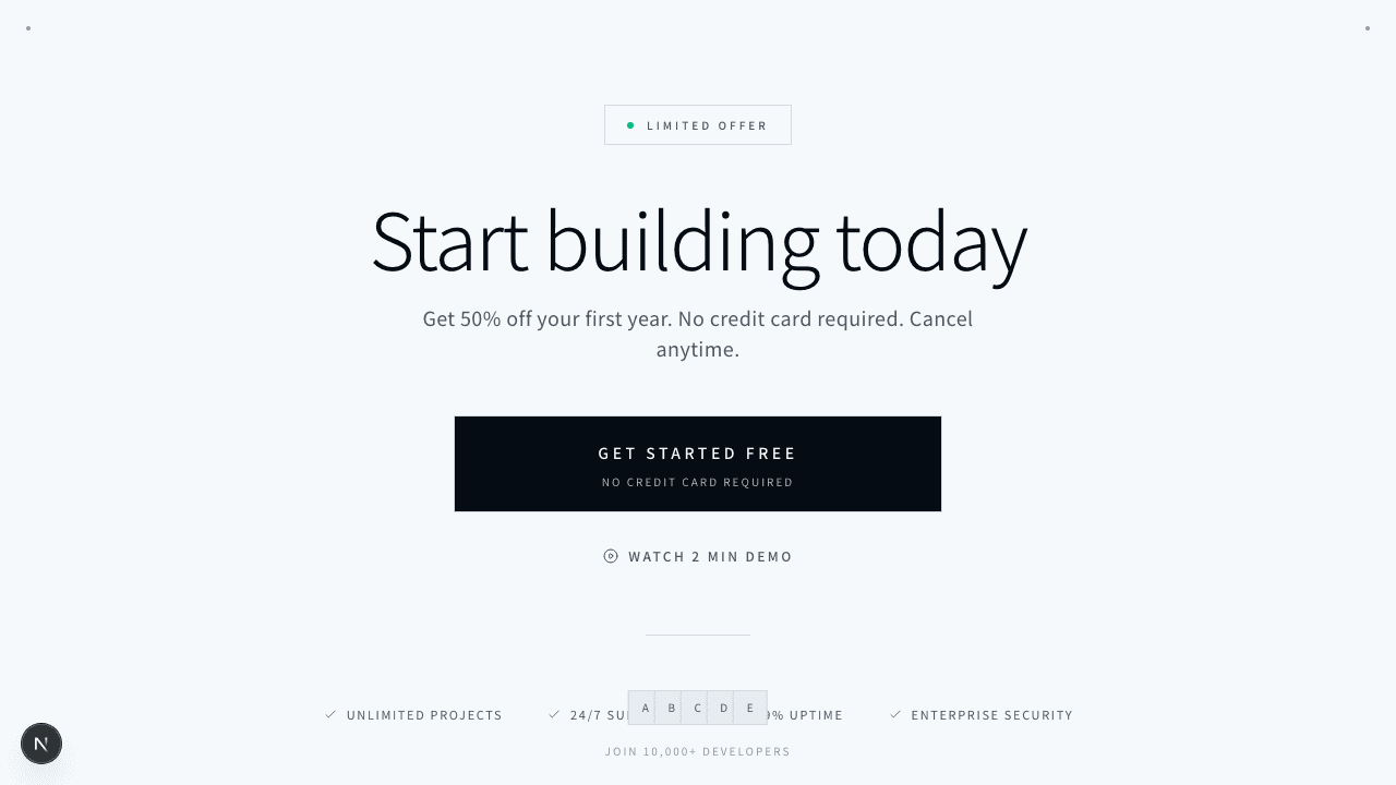 中央配置のテキストとCTAボタンのシンプルなヒーローセクション