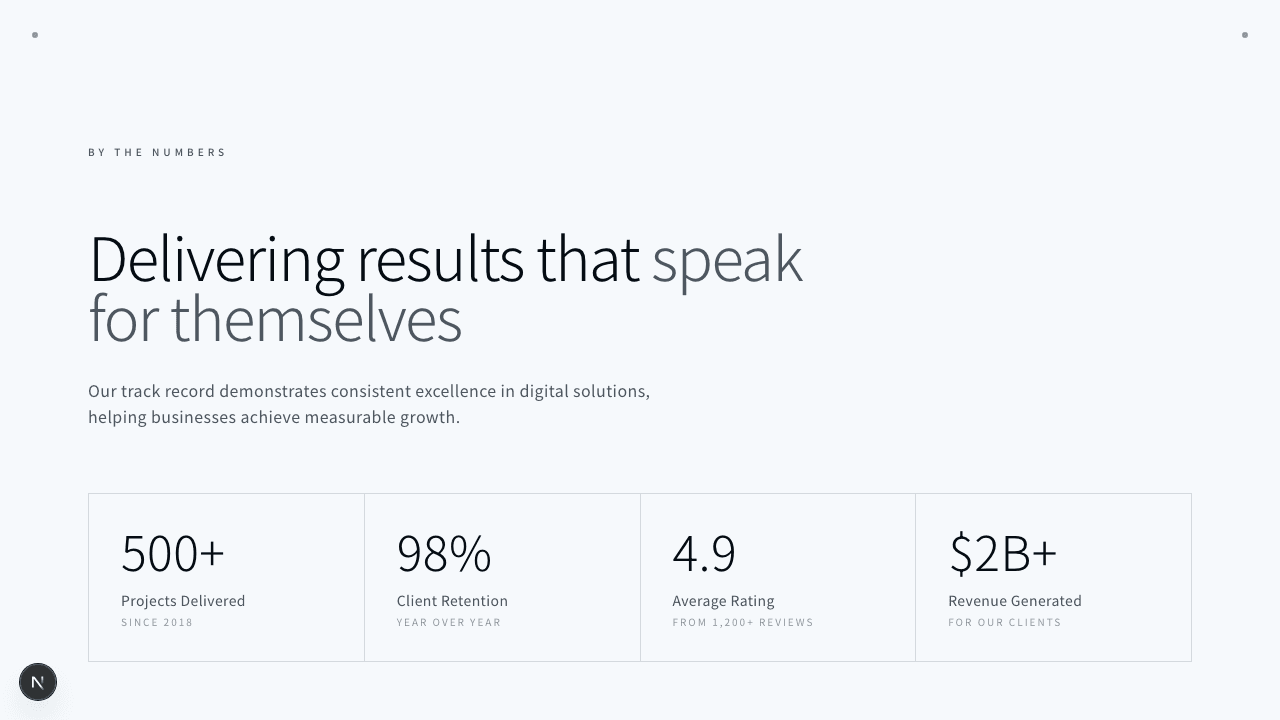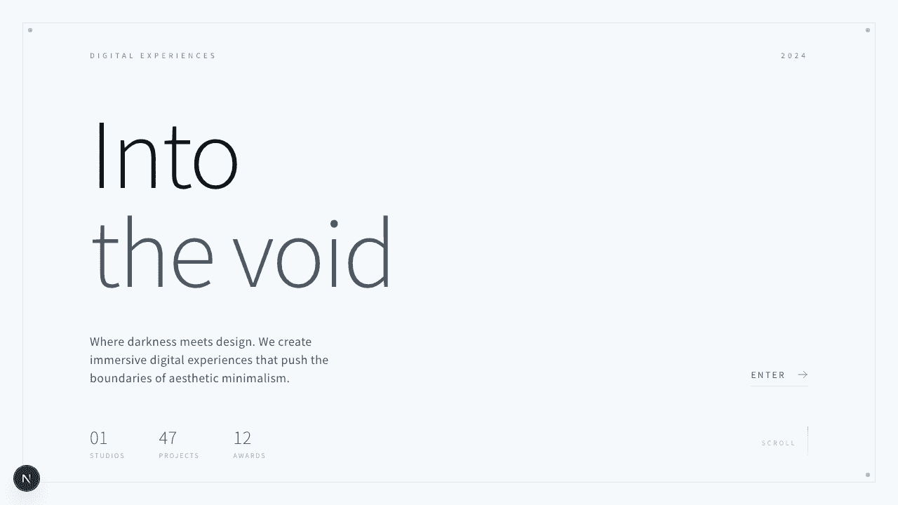 1export function HeroCentered001() {2 return (3 <section className="relative min-h-screen bg-background">4 {/* コーナードット装飾 */}5 <div className="absolute left-8 top-8 h-1.5 w-1.5 rounded-full bg-foreground/40" />6 <div className="absolute right-8 top-8 h-1.5 w-1.5 rounded-full bg-foreground/40" />7 <div className="absolute bottom-8 left-8 h-1.5 w-1.5 rounded-full bg-foreground/40" />8 <div className="absolute bottom-8 right-8 h-1.5 w-1.5 rounded-full bg-foreground/40" />910 {/* Center lines decoration */}11 <div className="absolute inset-x-0 top-1/2 h-px bg-border/50" />12 <div className="absolute inset-y-0 left-1/2 w-px bg-border/50" />1314 {/* メインコンテンツ */}15 <div className="relative mx-auto flex min-h-screen max-w-4xl flex-col items-center justify-center px-6 py-24">16 {/* Top label */}17 <div className="absolute top-24 left-1/2 -translate-x-1/2">18 <span className="text-[10px] font-medium uppercase tracking-[0.4em] text-muted-foreground/60">19 Est. 202420 </span>21 </div>2223 <div className="text-center">24 {/* 見出し */}25 <h1 className="mb-6 text-4xl font-light tracking-tight text-foreground sm:text-5xl md:text-6xl lg:text-7xl xl:text-8xl">26 Centered27 </h1>2829 {/* サブ見出し */}30 <div className="mb-8 flex items-center justify-center gap-4">31 <div className="h-px w-12 bg-border" />32 <span className="text-sm font-light tracking-[0.3em] text-muted-foreground">33 DESIGN STUDIO34 </span>35 <div className="h-px w-12 bg-border" />36 </div>3738 {/* 説明文 */}39 <p className="mx-auto mb-12 max-w-md text-base leading-relaxed text-muted-foreground">40 We craft digital experiences that are minimal, elegant, and41 purposefully designed for the modern web.42 </p>4344 {/* Single CTA */}45 <button className="inline-flex items-center justify-center border border-border bg-muted/50 px-10 py-4 text-xs font-medium uppercase tracking-[0.25em] text-foreground/80 transition-all hover:bg-muted hover:text-foreground">46 Explore Work47 </button>48 </div>4950 {/* Bottom info */}51 <div className="absolute bottom-24 left-1/2 -translate-x-1/2">52 <div className="flex items-center gap-8">53 <div className="text-center">54 <div className="text-xl font-light text-foreground/70">150+</div>55 <div className="mt-1 text-[9px] uppercase tracking-[0.2em] text-muted-foreground/60">56 Projects57 </div>58 </div>59 <div className="h-6 w-px bg-border" />60 <div className="text-center">61 <div className="text-xl font-light text-foreground/70">12</div>62 <div className="mt-1 text-[9px] uppercase tracking-[0.2em] text-muted-foreground/60">63 Awards64 </div>65 </div>66 <div className="h-6 w-px bg-border" />67 <div className="text-center">68 <div className="text-xl font-light text-foreground/70">8</div>69 <div className="mt-1 text-[9px] uppercase tracking-[0.2em] text-muted-foreground/60">70 Years71 </div>72 </div>73 </div>74 </div>75 </div>76 </section>77 );78}