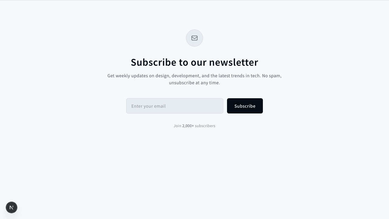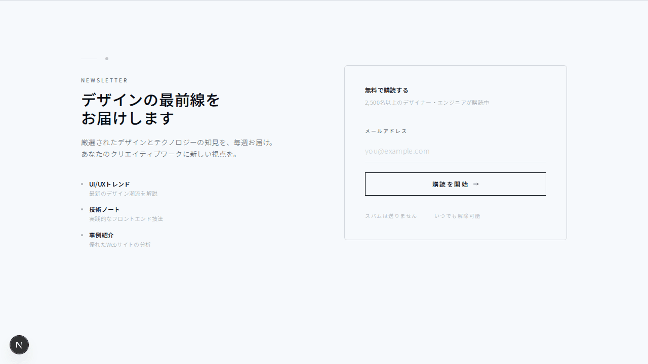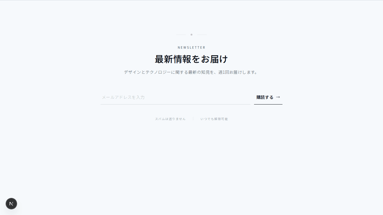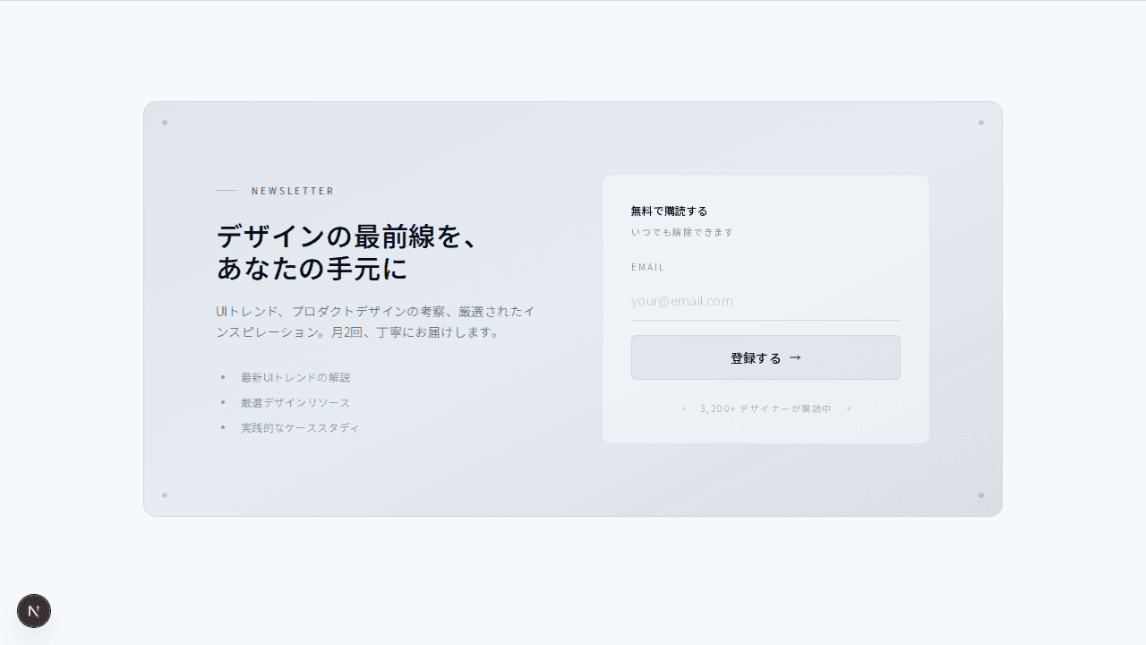 カードレイアウトに収まったニュースレター登録セクション。アイコンとコーナードットの装飾が特徴