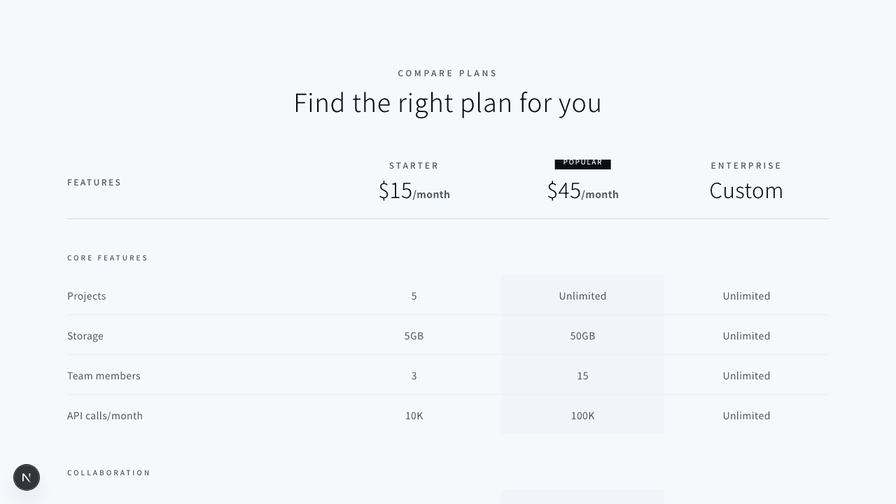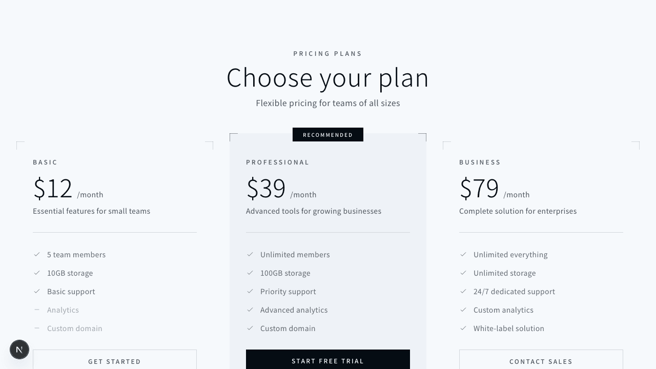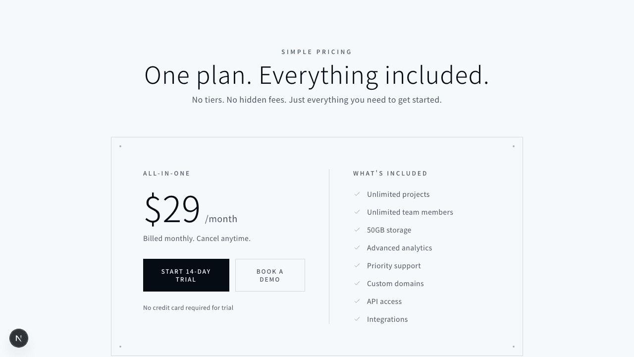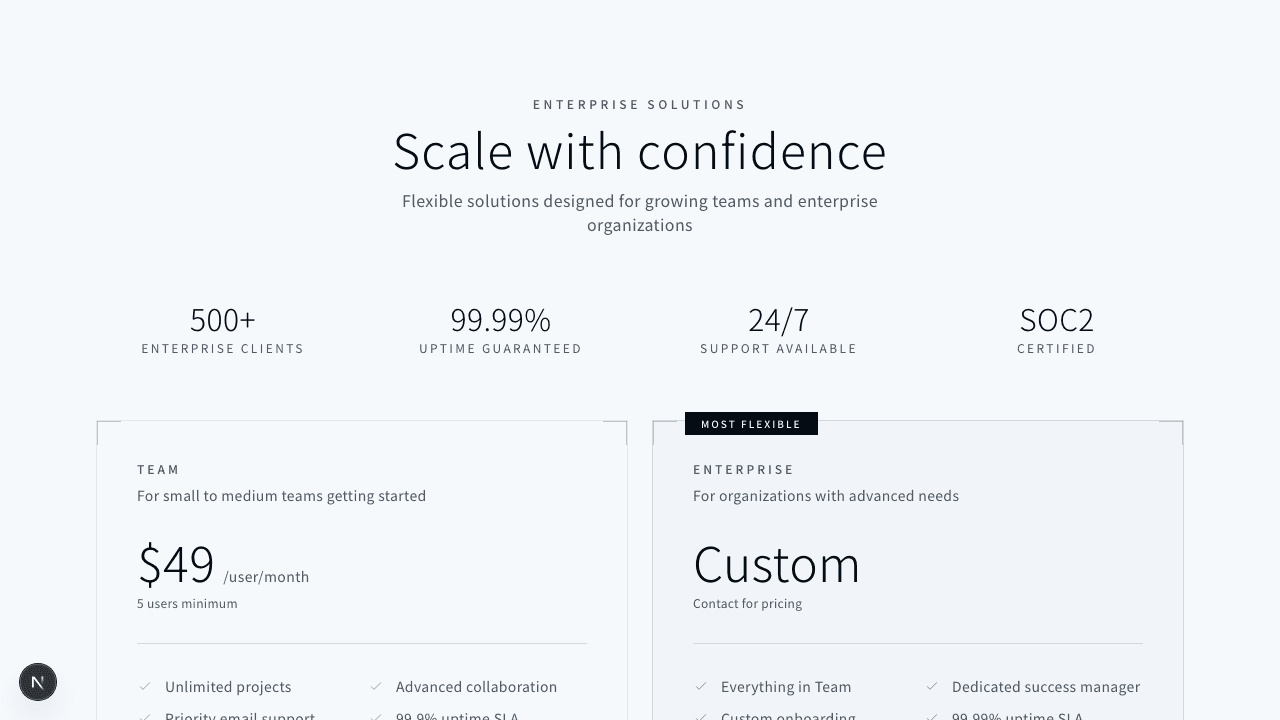1"use client";23import { useState } from "react";45export function PricingToggle001() {6 const [isYearly, setIsYearly] = useState(false);78 const plans = [9 {10 name: "STARTER",11 description: "For individuals and small projects",12 monthlyPrice: 12,13 yearlyPrice: 120,14 features: [15 "Up to 5 projects",16 "Basic analytics",17 "Email support",18 "1GB storage",19 ],20 cta: "Get Started",21 featured: false,22 },23 {24 name: "PROFESSIONAL",25 description: "For teams and growing businesses",26 monthlyPrice: 39,27 yearlyPrice: 390,28 features: [29 "Unlimited projects",30 "Advanced analytics",31 "Priority support",32 "50GB storage",33 "API access",34 "Custom domains",35 ],36 cta: "Start Free Trial",37 featured: true,38 },39 {40 name: "ENTERPRISE",41 description: "For large scale deployments",42 monthlyPrice: 99,43 yearlyPrice: 990,44 features: [45 "Everything in Pro",46 "Unlimited storage",47 "Dedicated support",48 "Custom integrations",49 "SLA guarantee",50 "SSO & SAML",51 ],52 cta: "Contact Sales",53 featured: false,54 },55 ];5657 // コーナードット58 const CornerDots = ({ visible = false }: { visible?: boolean }) => {59 if (!visible) return null;60 return (61 <>62 <div className="absolute top-3 left-3 h-1 w-1 rounded-full bg-foreground/40" />63 <div className="absolute top-3 right-3 h-1 w-1 rounded-full bg-foreground/40" />64 <div className="absolute bottom-3 left-3 h-1 w-1 rounded-full bg-foreground/40" />65 <div className="absolute bottom-3 right-3 h-1 w-1 rounded-full bg-foreground/40" />66 </>67 );68 };6970 return (71 <section className="bg-background py-24">72 <div className="mx-auto max-w-7xl px-4 sm:px-6 lg:px-8">73 {/* Header */}74 <div className="mx-auto mb-12 max-w-2xl text-center">75 <p className="mb-3 text-xs font-medium uppercase tracking-[0.3em] text-muted-foreground">76 Pricing77 </p>78 <h2 className="text-3xl font-light tracking-wide text-foreground sm:text-4xl">79 Simple, transparent pricing80 </h2>81 <p className="mt-4 text-base tracking-wide text-muted-foreground">82 Choose the plan that works for you83 </p>84 </div>8586 {/* Toggle Switch */}87 <div className="mb-16 flex items-center justify-center gap-4">88 <span89 className={`text-sm tracking-wide transition-colors ${90 !isYearly ? "text-foreground" : "text-muted-foreground"91 }`}92 >93 Monthly94 </span>9596 <button97 onClick={() => setIsYearly(!isYearly)}98 className="relative h-8 w-14 rounded-full border border-border bg-muted/50 transition-colors hover:bg-muted"99 aria-label={isYearly ? "Switch to monthly billing" : "Switch to yearly billing"}100 >101 <span102 className={`absolute top-1 h-6 w-6 rounded-full bg-primary transition-all ${103 isYearly ? "left-7" : "left-1"104 }`}105 />106 </button>107108 <span109 className={`text-sm tracking-wide transition-colors ${110 isYearly ? "text-foreground" : "text-muted-foreground"111 }`}112 >113 Yearly114 </span>115116 {/* Savings Badge */}117 <span className="ml-2 rounded-sm bg-muted px-2 py-1 text-[10px] font-medium uppercase tracking-[0.15em] text-muted-foreground">118 Save 17%119 </span>120 </div>121122 {/* Pricing Cards */}123 <div className="grid grid-cols-1 gap-6 md:grid-cols-2 lg:grid-cols-3">124 {plans.map((plan) => (125 <div126 key={plan.name}127 className={`relative p-8 transition-all ${128 plan.featured129 ? "border border-border bg-muted/50"130 : "border border-border/50 bg-transparent"131 }`}132 >133 <CornerDots visible={plan.featured} />134135 {/* Featured Badge */}136 {plan.featured && (137 <div className="absolute -top-3 left-1/2 -translate-x-1/2">138 <span className="bg-primary px-4 py-1 text-[10px] font-medium uppercase tracking-[0.2em] text-primary-foreground">139 Most Popular140 </span>141 </div>142 )}143144 {/* Plan Name */}145 <h3 className="text-xs font-medium uppercase tracking-[0.25em] text-muted-foreground">146 {plan.name}147 </h3>148149 {/* Price */}150 <div className="mt-4 mb-2">151 <span className="text-5xl font-light text-foreground">152 ${isYearly ? plan.yearlyPrice : plan.monthlyPrice}153 </span>154 <span className="ml-1 text-sm text-muted-foreground">155 /{isYearly ? "year" : "month"}156 </span>157 </div>158159 {/* Per month equivalent for yearly */}160 {isYearly && (161 <p className="text-xs tracking-wide text-muted-foreground">162 ${Math.round(plan.yearlyPrice / 12)}/month billed annually163 </p>164 )}165166 {/* Description */}167 <p className="mt-4 text-sm tracking-wide text-muted-foreground">168 {plan.description}169 </p>170171 {/* Divider */}172 <div className="my-6 h-px bg-border" />173174 {/* Features */}175 <ul className="space-y-3">176 {plan.features.map((feature) => (177 <li178 key={feature}179 className="flex items-center gap-3 text-sm tracking-wide text-muted-foreground"180 >181 <svg182 className="h-4 w-4 flex-shrink-0 text-foreground/40"183 fill="none"184 viewBox="0 0 24 24"185 stroke="currentColor"186 >187 <path188 strokeLinecap="round"189 strokeLinejoin="round"190 strokeWidth={1.5}191 d="M5 13l4 4L19 7"192 />193 </svg>194 {feature}195 </li>196 ))}197 </ul>198199 {/* CTA Button */}200 <button201 className={`mt-8 w-full py-3 text-xs font-medium uppercase tracking-[0.15em] transition-all ${202 plan.featured203 ? "bg-primary text-primary-foreground hover:bg-primary/90"204 : "border border-border text-muted-foreground hover:border-foreground/30 hover:text-foreground"205 }`}206 >207 {plan.cta}208 </button>209 </div>210 ))}211 </div>212213 {/* Footer */}214 <div className="mt-12 text-center">215 <p className="text-xs tracking-wide text-muted-foreground">216 All prices in USD. Taxes may apply.217 </p>218 </div>219 </div>220 </section>221 );222}