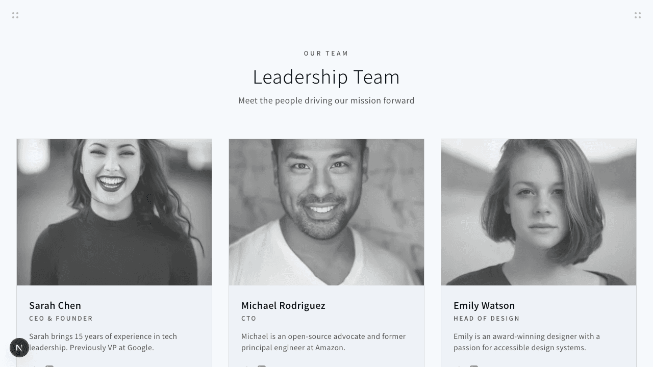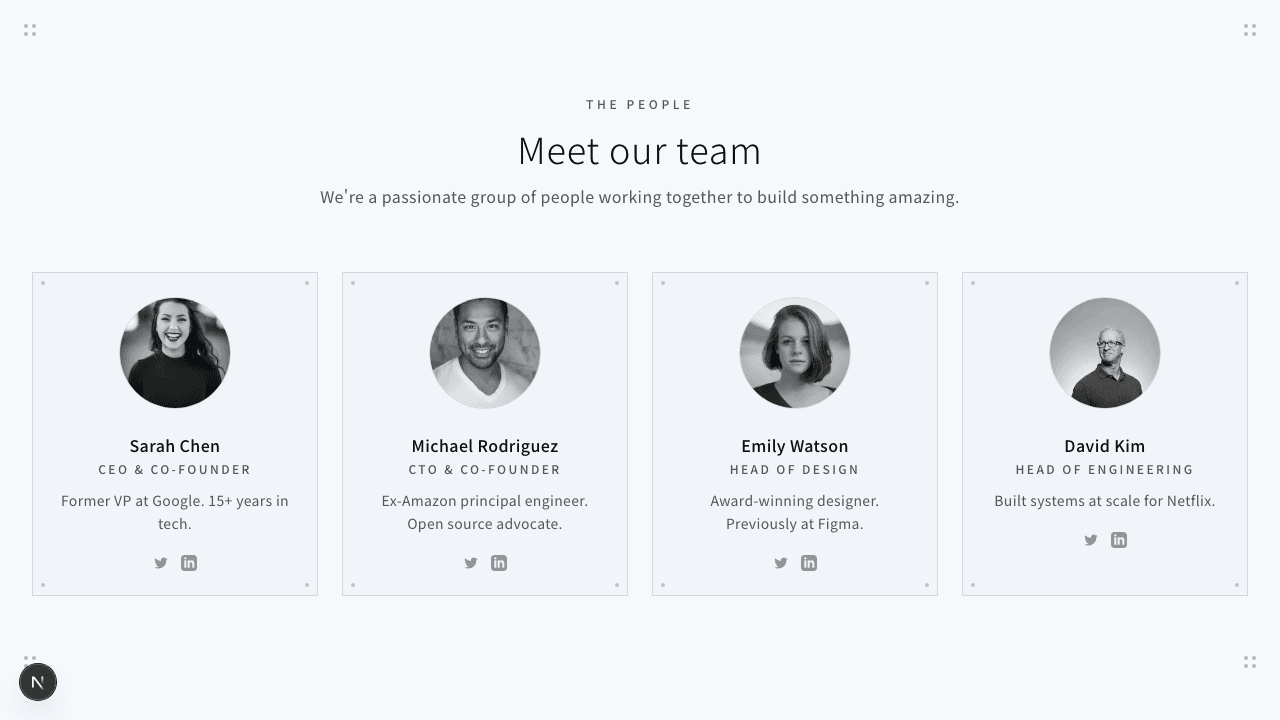 左右分割レイアウトのヘッダーとグリッドカードを組み合わせた、洗練されたチーム紹介セクション