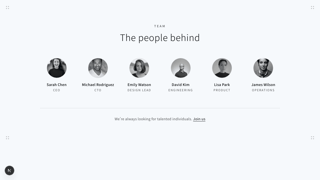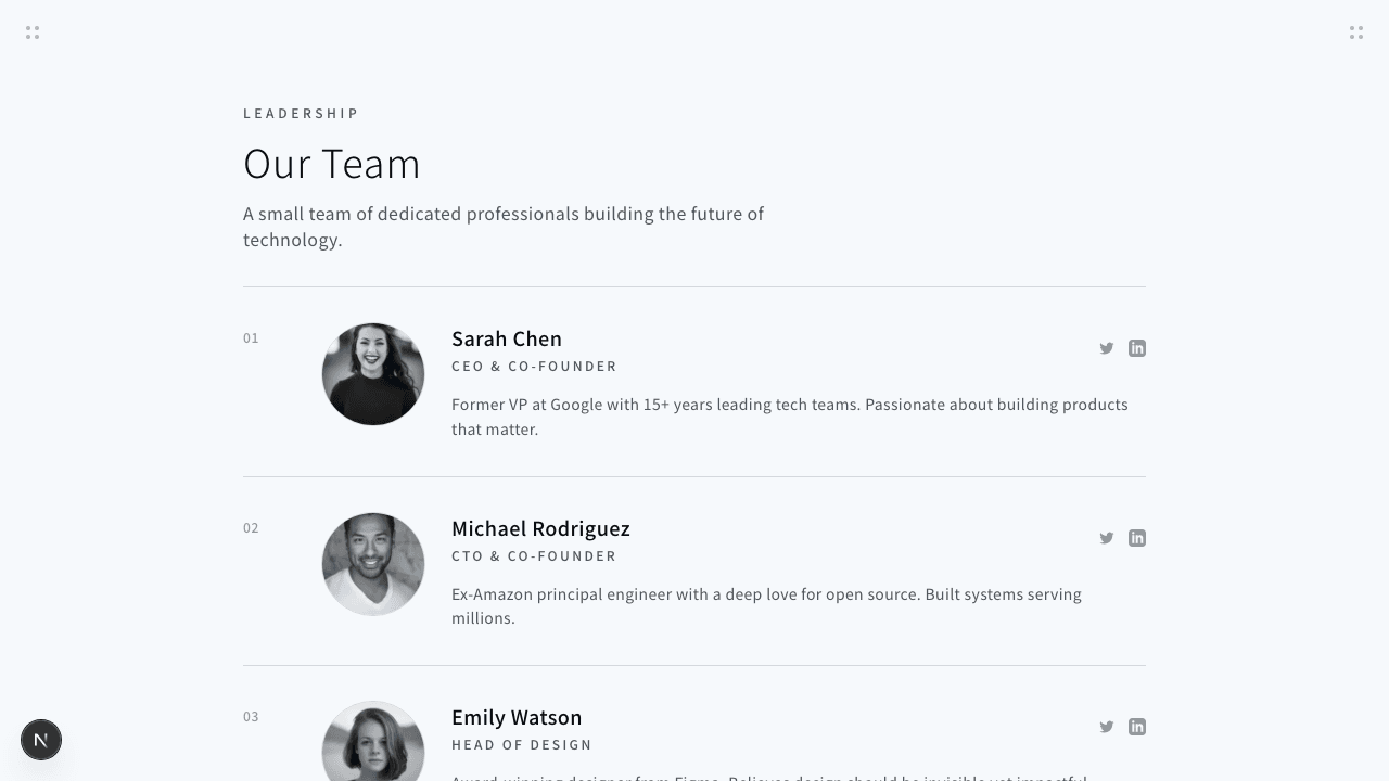 1// コーナードット装飾コンポーネント2function CornerDots({ className = "" }: { className?: string }) {3 return (4 <div className={`absolute h-3 w-3 ${className}`}>5 <div className="absolute left-0 top-0 h-1.5 w-1.5 rounded-full bg-muted-foreground/40" />6 </div>7 );8}910// メンバーデータ11const members = [12 {13 name: "田中 美咲",14 role: "CEO & Co-Founder",15 description:16 "10年以上のプロダクト開発経験を持ち、テクノロジーとデザインの融合を追求。",17 initials: "TM",18 },19 {20 name: "佐藤 健一",21 role: "CTO",22 description:23 "分散システムとクラウドアーキテクチャの専門家。オープンソースコミュニティに貢献。",24 initials: "SK",25 },26 {27 name: "鈴木 彩花",28 role: "Head of Design",29 description:30 "ユーザー中心設計のスペシャリスト。アクセシビリティを重視したデザインシステムを構築。",31 initials: "SA",32 },33 {34 name: "山田 翔太",35 role: "Lead Engineer",36 description:37 "フルスタックエンジニアとして複数のスタートアップで成長を牽引してきた経験を持つ。",38 initials: "YS",39 },40];4142export function TeamSplit001() {43 return (44 <section className="relative bg-background py-28">45 {/* コーナードット装飾 */}46 <CornerDots className="left-6 top-6" />47 <CornerDots className="right-6 top-6" />48 <CornerDots className="bottom-6 left-6" />49 <CornerDots className="bottom-6 right-6" />5051 <div className="mx-auto max-w-6xl px-4 sm:px-6 lg:px-8">52 {/* ヘッダー部分:左右分割 */}53 <div className="grid grid-cols-1 gap-12 lg:grid-cols-2 lg:gap-20">54 {/* 左:タイトル */}55 <div>56 <div className="flex items-center gap-4">57 <div className="h-px w-8 bg-border/40" />58 <p className="text-[10px] uppercase tracking-[0.3em] text-muted-foreground">59 Our Team60 </p>61 </div>62 <h2 className="mt-6 text-3xl font-medium tracking-wide text-foreground sm:text-4xl">63 ビジョンを共有する64 <br />65 チーム66 </h2>67 </div>6869 {/* 右:説明文 */}70 <div className="flex items-end">71 <p className="text-sm font-light leading-relaxed text-muted-foreground lg:max-w-sm">72 多様なバックグラウンドを持つメンバーが集まり、73 テクノロジーの力で社会に新しい価値を届けることを目指しています。74 一人ひとりの専門性が、プロダクトの品質を支えています。75 </p>76 </div>77 </div>7879 {/* 区切り線 */}80 <div className="my-16 h-px bg-border/40" />8182 {/* メンバーリスト */}83 <div className="grid grid-cols-1 gap-px overflow-hidden rounded-lg border border-border bg-border sm:grid-cols-2">84 {members.map((member) => (85 <div86 key={member.name}87 className="group relative bg-background p-8 transition-colors duration-300 hover:bg-muted/30 sm:p-10"88 >89 {/* 番号とイニシャル */}90 <div className="flex items-start justify-between">91 <div className="flex h-12 w-12 items-center justify-center rounded-full border border-border text-foreground/60 transition-colors duration-300 group-hover:border-foreground/20 group-hover:text-foreground">92 <span className="text-xs font-medium tracking-wider">93 {member.initials}94 </span>95 </div>96 <div className="h-1 w-1 rounded-full bg-muted-foreground/30" />97 </div>9899 {/* メンバー情報 */}100 <div className="mt-6">101 <h3 className="text-base font-medium tracking-wide text-foreground">102 {member.name}103 </h3>104 <p className="mt-1.5 text-[10px] uppercase tracking-[0.2em] text-muted-foreground/60">105 {member.role}106 </p>107 </div>108109 {/* 説明 */}110 <p className="mt-4 text-sm font-light leading-relaxed text-muted-foreground">111 {member.description}112 </p>113114 {/* 区切り装飾 */}115 <div className="mt-6 flex items-center gap-3">116 <div className="h-px w-6 bg-border/40" />117 <div className="h-1 w-1 rounded-full bg-foreground/10" />118 </div>119 </div>120 ))}121 </div>122123 {/* フッター */}124 <div className="mt-12 flex flex-col items-center justify-between gap-4 sm:flex-row">125 <p className="text-[10px] tracking-[0.15em] text-muted-foreground/50">126 {members.length}名のコアメンバー127 </p>128 <p className="text-sm tracking-wide text-muted-foreground">129 仲間を募集しています。{" "}130 <a131 href="#"132 className="text-foreground underline underline-offset-4 transition-colors hover:text-muted-foreground"133 >134 採用情報を見る135 </a>136 </p>137 </div>138 </div>139 </section>140 );141}